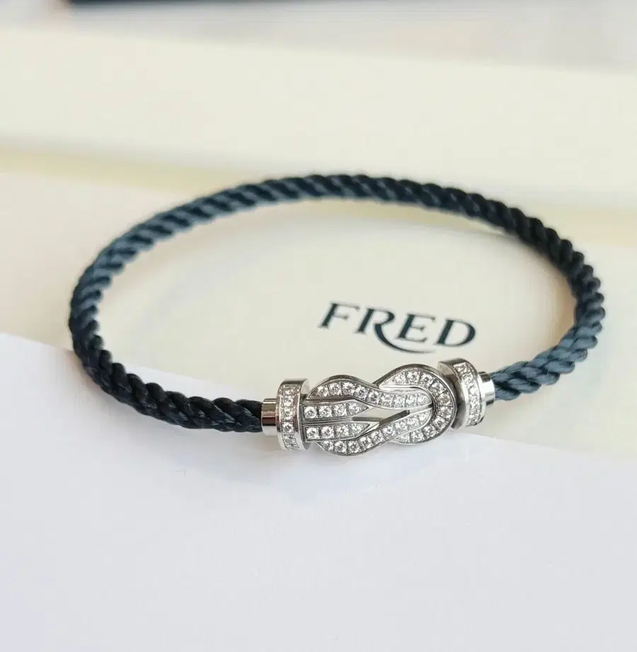 블랙 컬러의 프레드 포스텐 팔찌입니다. 매듭 모양 장식이 포인트로 들어가 있습니다. 은색 버클에 큐빅이 박혀 있어 고급스러움을 더했습니다. 문의 없으시면 바로 안전결제해주시면 됩니다!