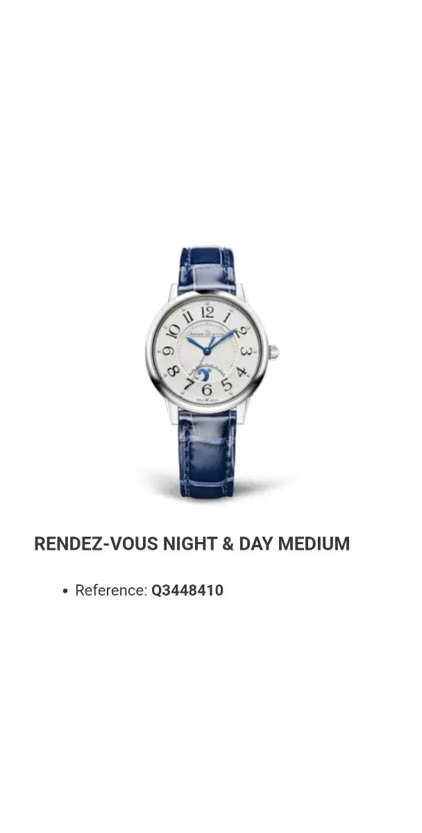 우아함의 정석, 예거 르쿨트르 랑데뷰 나잇앤데이 (34mm 미디엄 24년 11월 더현대 백화점 스탬핑) "시간 그 이상의 우아함, 랑데뷰" 여성 드레스 워치 중 가장 독보적인 아우라를 가진 예거 르쿨트르 랑데뷰 나잇앤데이 미디엄 모델입니다. 빛에 따라 은은하게 빛나는 실버 기요셰 다이얼과 블루 핸즈의 조화가 실물로 보면 훨씬 아름답습니다. [상품 핵심 요약] 구매처: 더현대 백화점 서울 (백화점 정식 스탬핑) 구매시기: 2024년 11월 (보증기간 넉넉) 상태: 생활 기스 정도 구성: 시계 본품(블루 스트랩) + 미사용 그레이 엘리 스트랩(150만원 상당) + 보증서 + 풀박스 [가격 메리트] 구매가: 시계 1,775만원 + 추가 스트랩 (회색) 150만원 = 총 1,925만원 혜택: 정가 대비 약 575만원 저렴하게 구매 [상세 설명] 예거의 대표 여성 라인인 랑데뷰 나잇앤데이 미디엄(34mm) 모델입니다. 기요셰 다이얼과 6시 방향의 해/달 인디케이터가 정말 우아한 시계입니다. 기본 블루 스트랩 외에 분위기에 따라 바꿔 낄 수 있는 **150만원 상당의 그레이 컬러 정품 스트랩(미사용)**도 같이 드립니다.