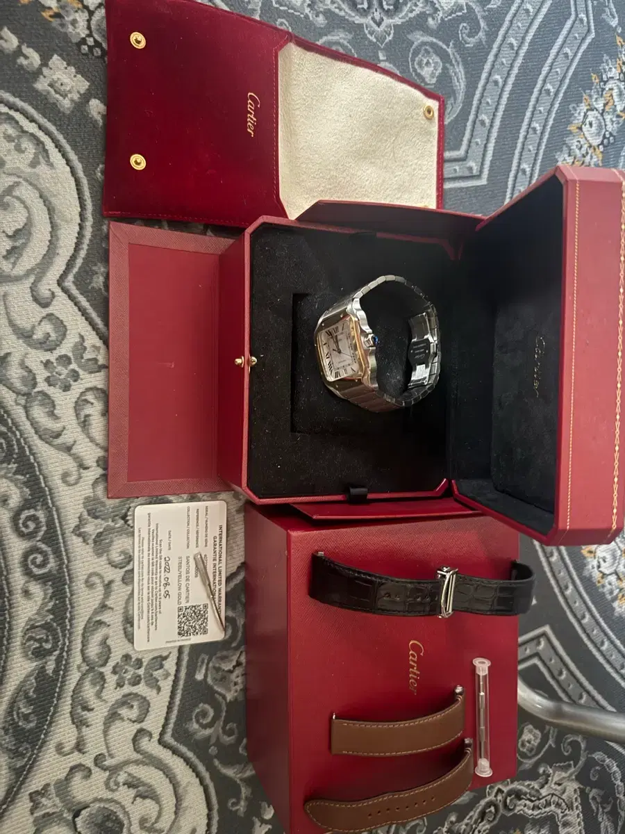 까르띠에 산토스 콤비 라지 사이즈 판매합니다. 시계 풀박스 구성에 여분 가죽 스트랩 2개까지 포함되어 있습니다. 2022년 8월에 구매한 제품으로, 상태 좋습니다.