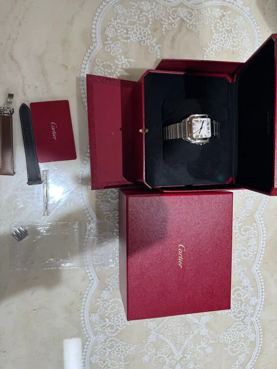 까르띠에 산토스 미디움 콤비입니다 노폴리싱 제품이며 배젤은 필름붙이고 사용해서 깨끗합니다 끼르띠에 케어 무상보증 2029년 12월까지 연장되어 있습니다 구성품 모두 보유중입니다