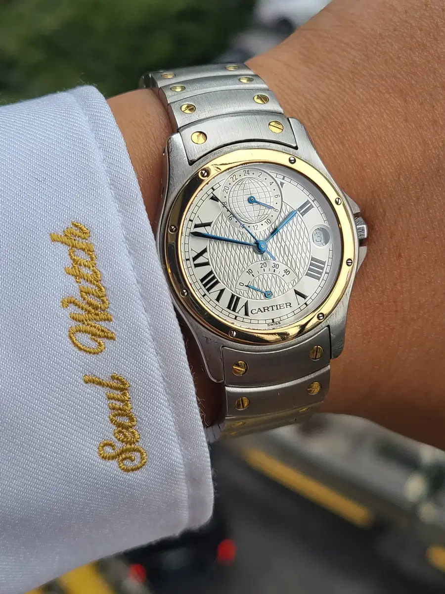 멋진 까르띠에 시계 소개합니다. 까르띠에 산토스 롱드 150주년 한정판 GMT 파워리저브 LM 라지 18K 콤비 남성용 모델입니다. 아마 국내에 갖고 계신 분 많이 없을 거라 생각 드는 모델입니다. 산토스 150주년 기념으로 발매했던 스페셜 한정판 모델이며, 전 세계 1847개만 생산되었습니다. 소개하는 시계는 1847개의 시계 중에서 679번째 리미티드 넘버링이 탑재된 상품입니다. (★사진참조) 1847년부터 1997년까지 150주년 역사적인 기념을 담아놓은 산토스 모델이며, 시계 뒷면에는 러브 까르띠에 하트 각인과 함께 스페셜 각인이 탑재됩니다. N.0679/1847 숫자가 인그레이빙 매우 고급스럽게 새겨져있습니다. (★사진참조) 한정판 모델이라 일반 산토스와는 많은 차이점을 갖추고 있는데, 대표적으로 기요쉐 세공 기법이 적용된 다이얼과 GMT 및 파워리저브 기능을 갖추고 있는 컴플리케이션 기능 입니다. 12시 방향에는 다른 나라의 시간을 확인할 수 있는 글로벌 GMT 24시간계 기능이 탑재되어 있으며, 하단 부에는 시계의 구동 에너지 40시간을 확인할 수 있는 파워리저브 (Power Reserve) 인디케이터 기능이 들어갑니다. (★사진참조) 제가 올린 클로즈업 사진을 자세히 보시면, 다이얼 중앙부에 세로로 물결무늬가 들어간 엄청난 세공 기술과 디테일을 확인하실 수 있으며 시계보다는 마치 예술품을 보는 듯한 착각을 일으킵니다. 사진으로는 잘 표현이 안되는데, 실물로 보고 있으면 누구나도 빠져들 수 있을 만큼 엄청난 정교함을 보여주는 시계보다는 마치 예술 작품에 가까운 기술력이라고 생각됩니다. 기요쉐(Guilloché) 다이얼 이란, 직접 사람이 까르띠에 메뉴팩쳐 공장에서 한땀한땀 수작업으로 다이얼 위에 모양을 내는 것을 말합니다. (★사진참조) 진정한 세월을 거스르는 가치를 품고 있는 것이 비로소 '명품'의 가치를 보존시킨 까르띠에 다운 모습이라고 합니다. 시간이 흘러 지금은 단종된 시계라, 발매 당시의 구성품은 따로 없으나 애초에 본사 보증기간이 끝난 시계이기 때문에 큰 의미는 없습니다. 다만, 현재 공식 까르띠에 홈페이지에 제 회원 아이디로 정품 인증 등록까지 완료된 시계입니다. (★사진참조) 이후 양도받아 가시는 분께서는 까르띠에 멤버십 회원가입하시면, 제가 시계 판매 및 양도 드리면서 본인 아이디로 정품 등록하시면 됩니다. 차고 다니시면 남녀노소 불문하고 (특히 여성들) 다들 바로 알아보는 까르띠에 시계입니다. 워낙 상태가 좋기 때문에 선물용으로 구입하셔도 좋고, 본인이 직접 소장 및 착용하셔도 좋습니다. 국내에서는 볼 수 없는 시계지만, 현재 해외에서 동일한 모델 약 천만 원 중반대 중고 가격 형성을 이루며 판매되고 있습니다. (★사진참조) 판매하는 시계는 교체되거나 수리한 적 없는 완벽한 컨디션의 발매 당시 모두 순정이며, 상태가 전체적으로 아주 좋습니다. 국내인 점 감안하여 저렴하게 양도합니다. 150주년 기념으로 단종된 이후 더욱 높은 수요와 인기를 자랑하는 시계이며, 지금은 이렇게 상태 좋은 산토스 롱드 한정판 모델은 거의 구할 수도 없을뿐더러 갖고 계신 분들이 판매하지도 않습니다. 추후에 충분히 좋은 가치를 인정받을 수 있는 시계입니다. 진정한 명품은 아무리 세월과 유행이 흐르고 지나도, 이렇게 고유의 디자인은 오랜 기간 간직하는 것이 원칙입니다. 까르띠에의 정교한 만듦새와 뛰어난 기술력이 들어간 시계이므로, 저가형 기타 다른 시계와는 전혀 차원이 다른 시계임을 명심하셨으면 합니다. 평소 상태 좋은 까르띠에 시계를 찾으셨던 분들이나, 제대로 된 까르띠에 시계를 수집 및 착용하실 분들도 모두 추천합니다. 시계 상태는 보시는 바와 같이 연식대비 매우 깔끔한 상태를 유지 중입니다. 서울워치가 판매하는 시계는 100% 정품(Genuine) 보증해 드리며, 서울워치 보증서 및 케이스와 함께 양도됩니다. 모든 시계는 기본 점검이 완료된 상태이며, 추후 기계적 문제 발생 시 책임지고 수리 도와드립니다. 감사합니다. [시계장점] - 까르띠에 대표적인 전통 럭셔리 워치, 산토스 - 높은 희소성과 소장가치를 지닌 원형의 산토스 롱드 모델 - 고급스러운 아이보리 컬러의 블랙 로만 다이얼 - 까르띠에 아이코닉 상징적 블루핸즈 및 블루 카보숑 크라운 - 클래식의 상징인 까르띠에 전통로고 단방향 버클 - 시계 상태 최상