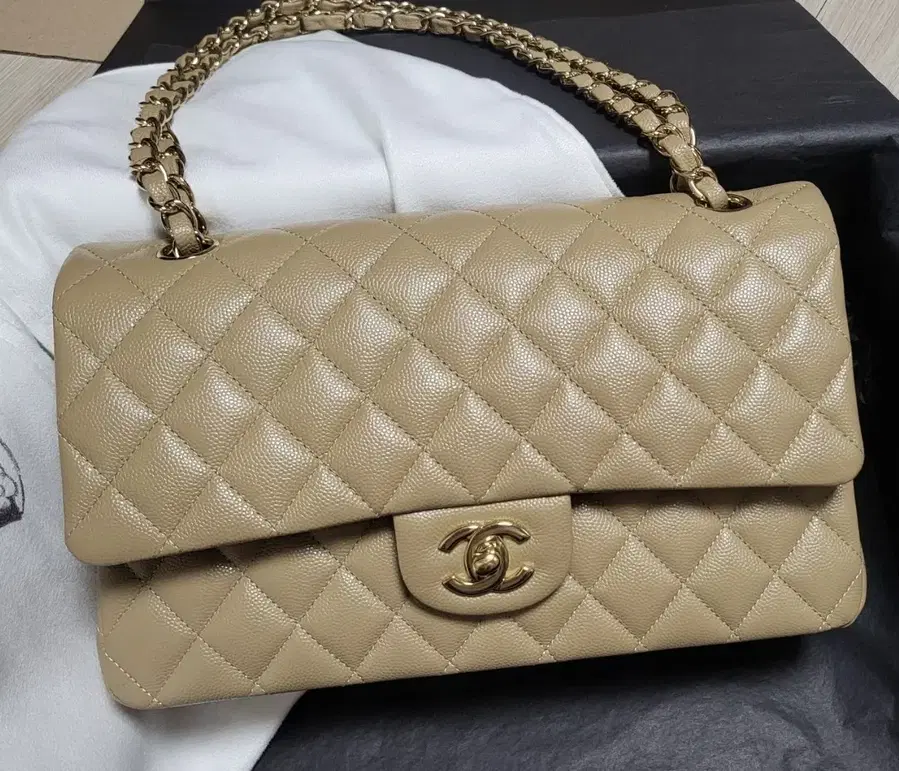 샤넬 클래식 미디움 다크 베이지 캐비어 금장